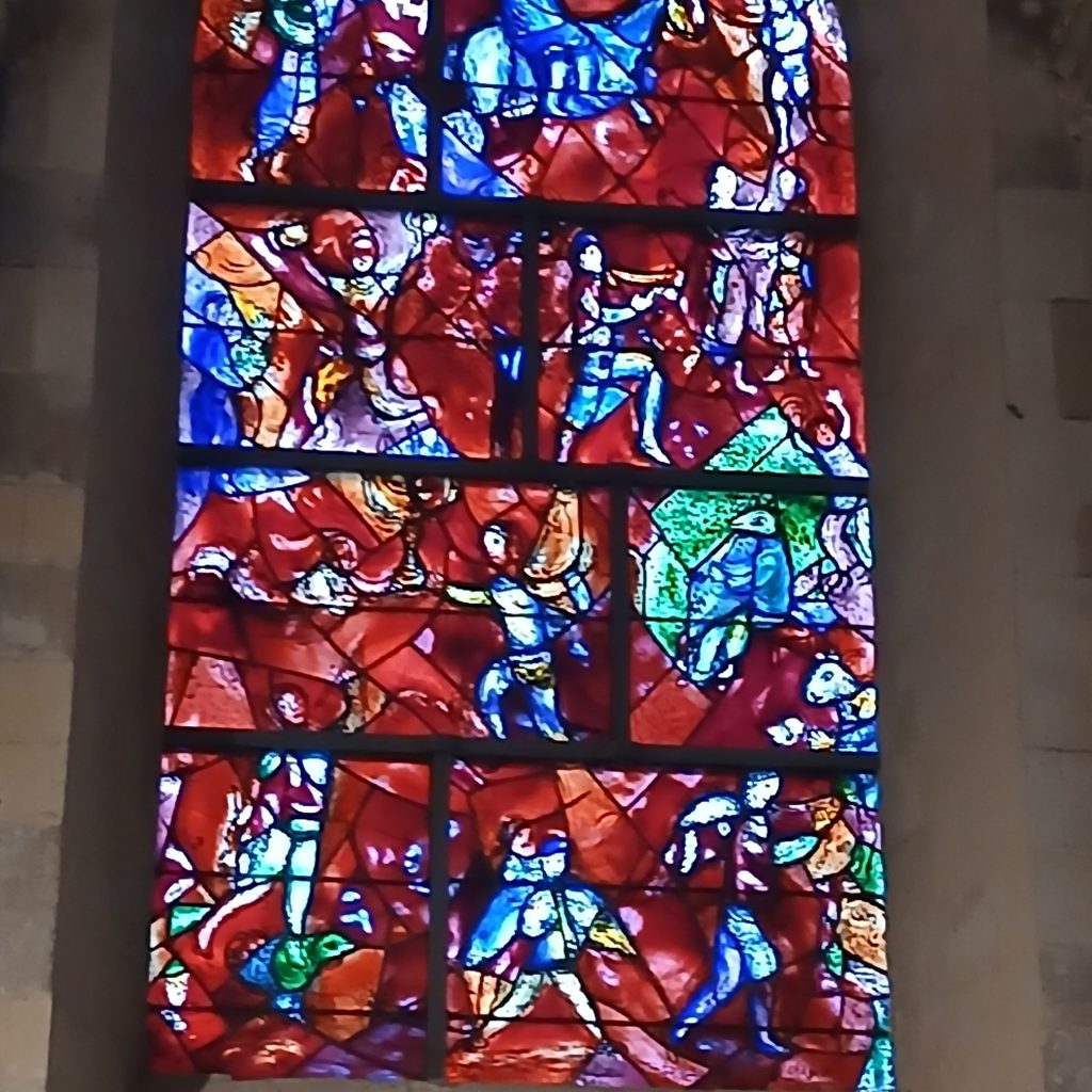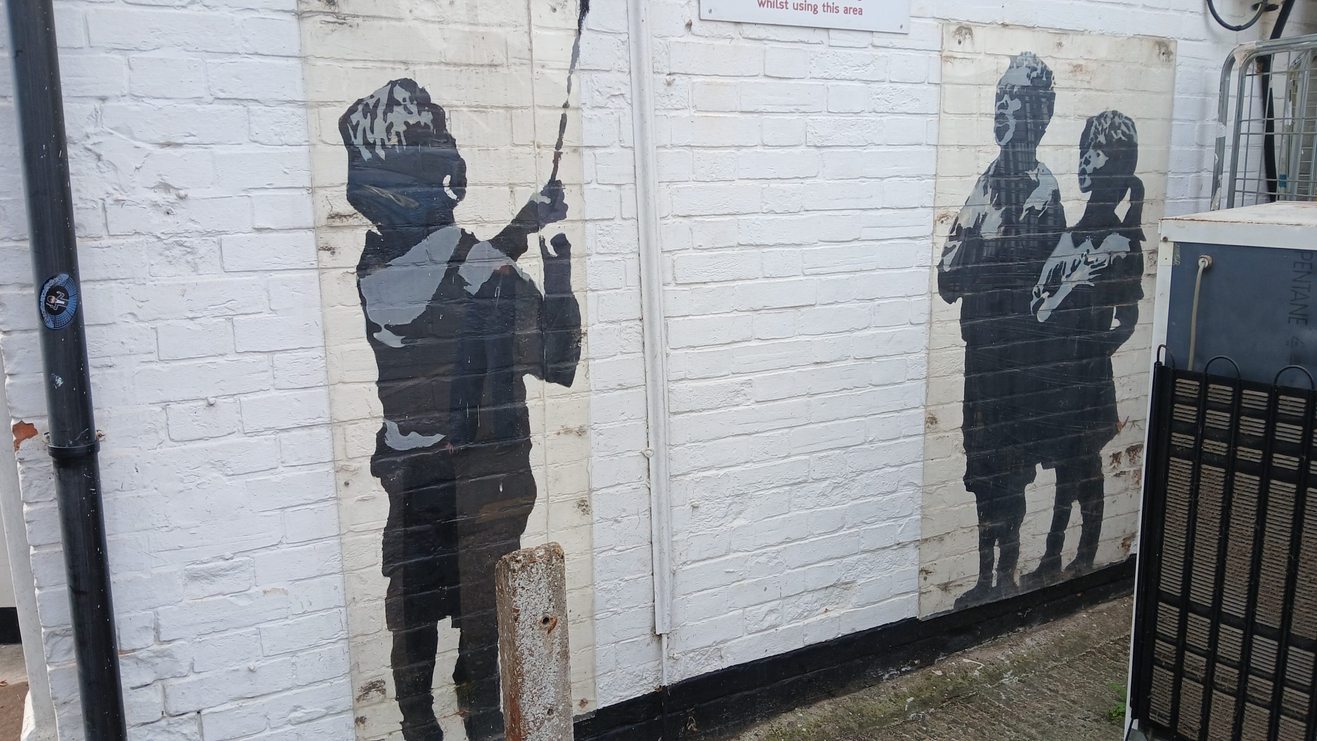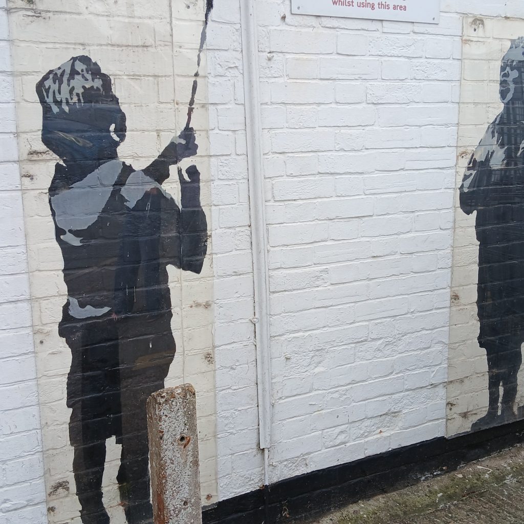 En toen waren we in Chichester. Gisteren in de avond zijn we aangekomen. We hadden rond 11:30 de ferry vanuit Calais, dus rond de middag in Dover aangekomen. Onderweg naar het park, kwamen we door “High Halden”, waar Lodewijk een Banksy-achtig kunstwerk op een muur zag. We zijn even terug gegaan om het te bekijken. De muurschildering was tegen vandalisme veilig gesteld met plexiglas. Google leerde ons dat het kunstwerk nooit door Banksy is opgeëist. Wie dan de maker wel is, blijft een mysterie.